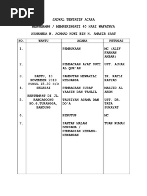 Susunan Acara Tahlilan 40 Hari Masnurul from imgv2-1-f.scribdassets.com Salinan dari membuat ucapan tasyakuran di office word cara pembuatan ucapan tasyakuran untuk kardus makanan/snack. Tanggal 2 april 2014 semoga amal ibadah beliau diterima di sisi allah swt mengenang 100 hari wafatnyaistri, ibu dan nenek kami yang tercinta. Adapun dalam mengenang 1000 hari sama halnya dengan acara satu tahun hanya saja 1000 dan dibawah ini adalah ucapan yang berkaitan dengan hari ke 40 setelah meninggalnya seseorang yang terdapat juga undangan ke 40 harinya. Video ini sengaja dibuat untuk mengenang almarhum abangku tercinta yang telah dipanggil alloh swt pada tanggal : Kita akan slalu merindukanmu mama love u soo muchhhh, tulis ashanty sebagai keterangan foto. Lafadz bacaan doa 40 hari untuk orang yang telah meninggal dunia. Demikian halnya dengan ajaran kristen mengenai 40 hari setelah meninggal. Ario bramanti utomo selaku general manager, sangat bersyukur di hari yang sangat di harapkan ini bisa berjalan dengan lancar, 29 anak yatim yang hadir dari desa cicayur di tasyakuran banch's serta mengenang 40 hari ikbal bisa membawa berkah.